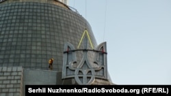 В Киеве на монумент "Родина-мать" установили герб Украины – трезубец, сообщает УНИАН.